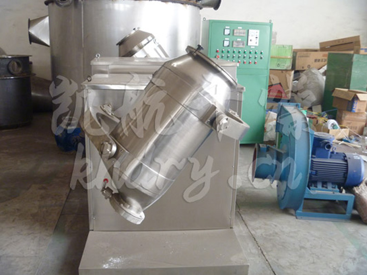 装料的筒体在主动轴的带动下,作周而复始的平移、转动和翻滚等复合运动,促使物料沿着筒体作三向复台运动,从而实现多种物料的互相流动、扩散、积聚、掺杂.以达到均匀混合的目的。