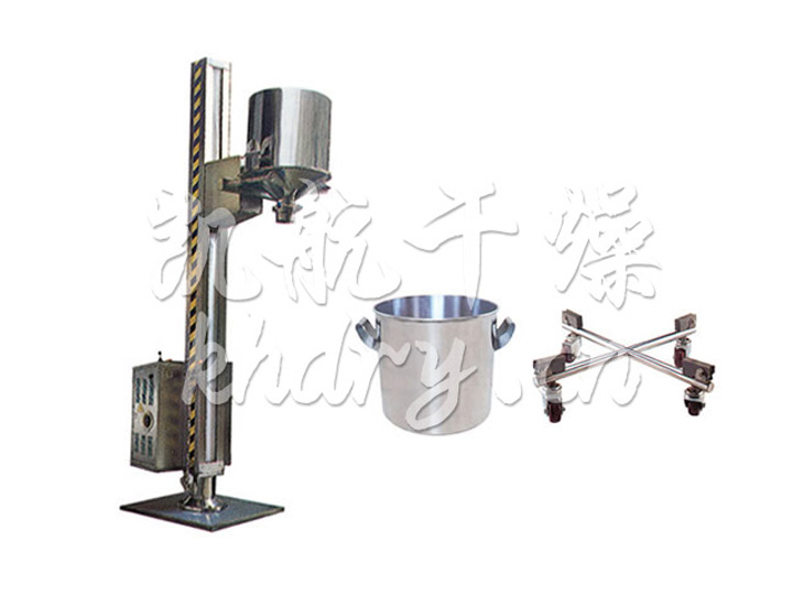 TJG 系列固定提升加料机由两部分组成,即提升机及底座。提升机由机架、液压提升系统及料门翻转机构组成。工作时,先将提升机的料门与料桶扣合,启动提升操作杆,料门与料桶一起上升,启动翻转操作杆,料桶即可番转180度,呈底桶向上姿态并移动到所需位置,利用料门上出料蝶阀,可很容易将物料加入所需的工艺设备中。