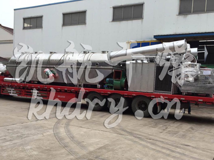 物料自进料进口进入机内,在振动力作用下,物料沿水平面流化床抛掷,向前连续运动,热风向上穿过流化床同湿物料换热后,湿空气经旋风分离器除尘后由排风1:3排出.干燥物料由排料进口排出。