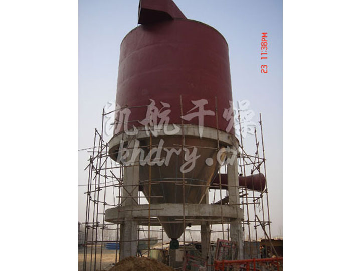 该生产线由供料系统、介质循环系统、空气加热净化系统、干燥塔系统、收料系统、控制系统等多个系统整合而成。主塔系统集中了目前喷雾干燥工程的所有尖端技术,喷干机组的收料系统由一级旋风分离器+布袋除尘器组合形成。一级旋风采用高气量高效率旋风进行收集,其收粉率能达到96%左右分,而布袋除尘器是针对蛋白粉类除尘专门设计的优化设备,能使物料与风进行完全分离并沉降,布袋为拒水防油防静电布袋,过滤目数可达500目以上。